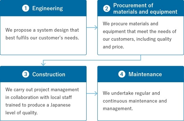 From the formulation of business plans in Japan to the construction work, operation start-up and conservation/maintenance in the target country, we provide seamless follow-up.