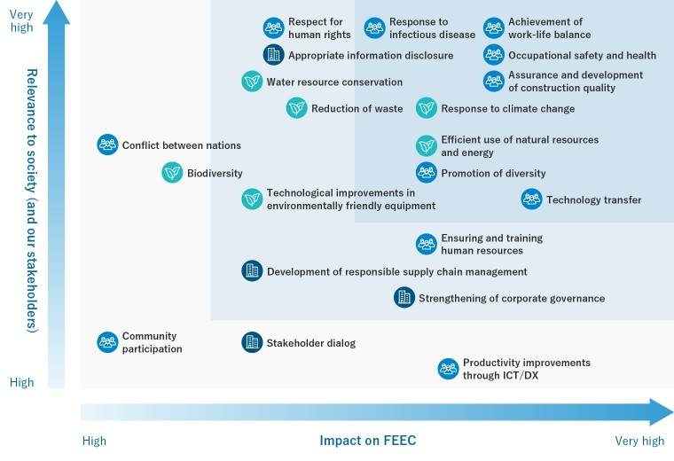 At the Fuji Electric E&C (“FEEC”) Group, we have identified eight material issues that we must act on as matters of priority. These material issues will enable us to contribute to the achievement of the SDGs and solve other social challenges through our businesses, as well as achieve medium-to long-term growth.