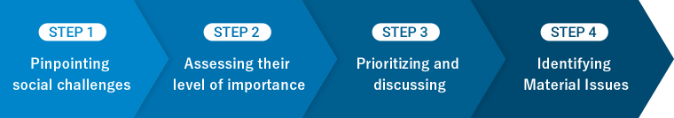In line with social challenges in Japan and overseas, their relevance to society (and our stakeholders) and their impact on our management, using Steps 1 to 4 below we have identified eight material issues for us to address.
