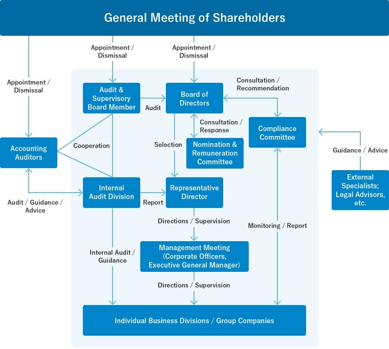 - In line with the basic approach to corporate governance outlined above, Fuji Electric Engineering & Construction chooses to be a Company with an Audit & Supervisory Board, believing that separating management supervision and monitoring from business execution functions, and having Audit & Supervisory Board Members and an Audit & Supervisory Board, who are independent of the Board of Directors, perform appropriate supervision and monitoring functions by exercising their independent information-gathering capabilities, will contribute to achieving compliance.
